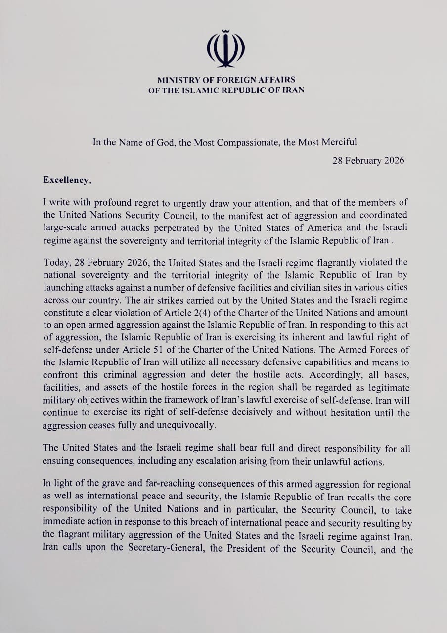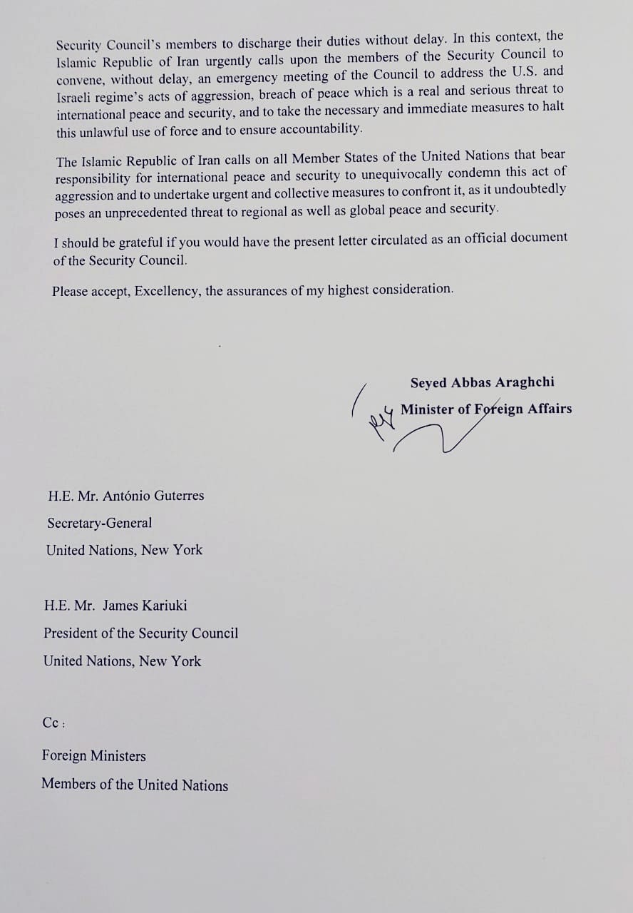 Letter from Foreign Minister of the Islamic Republic of Iran to the UN Secretary-General and the President of the Security Council on the joint large scale armed attacks perpetrated by the United States of America and Israeli Regime against the sovereignty and territorial integrity of the Islamic Republic of Iran.