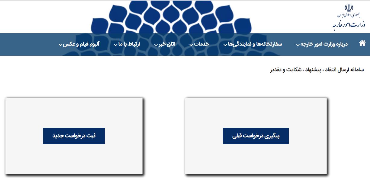 هموطنان گرامی میتوانند با مراجعه به صفحه انتقادات و پیشنهات در سایت رسمی وزارت امور خارجه به آدرس زیر هرگونه انتقاد و پیشنهاد خود نسبت به امور مربوط به فعالیت های وزارت امور خارجه از جمله امور کنسولی و غیره را مطرح نمایند: